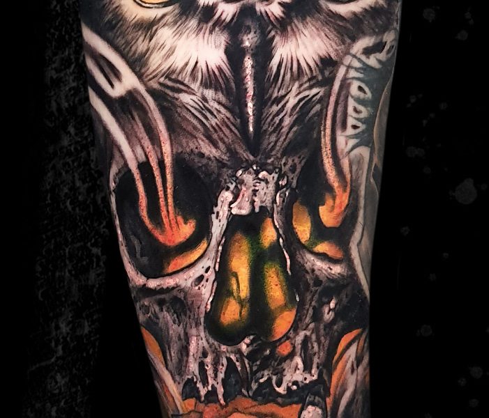 This piece is based on a painting by the costumer, adapted to tattoo. Done in 2 sessions.