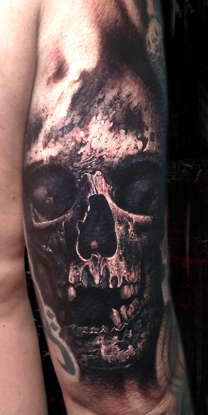 [vc_row][vc_column][vc_column_text]Black and grey skull tattoo in the back part of the arm. In this case we wonted a dark and detailed piece, playing with different kinds...
