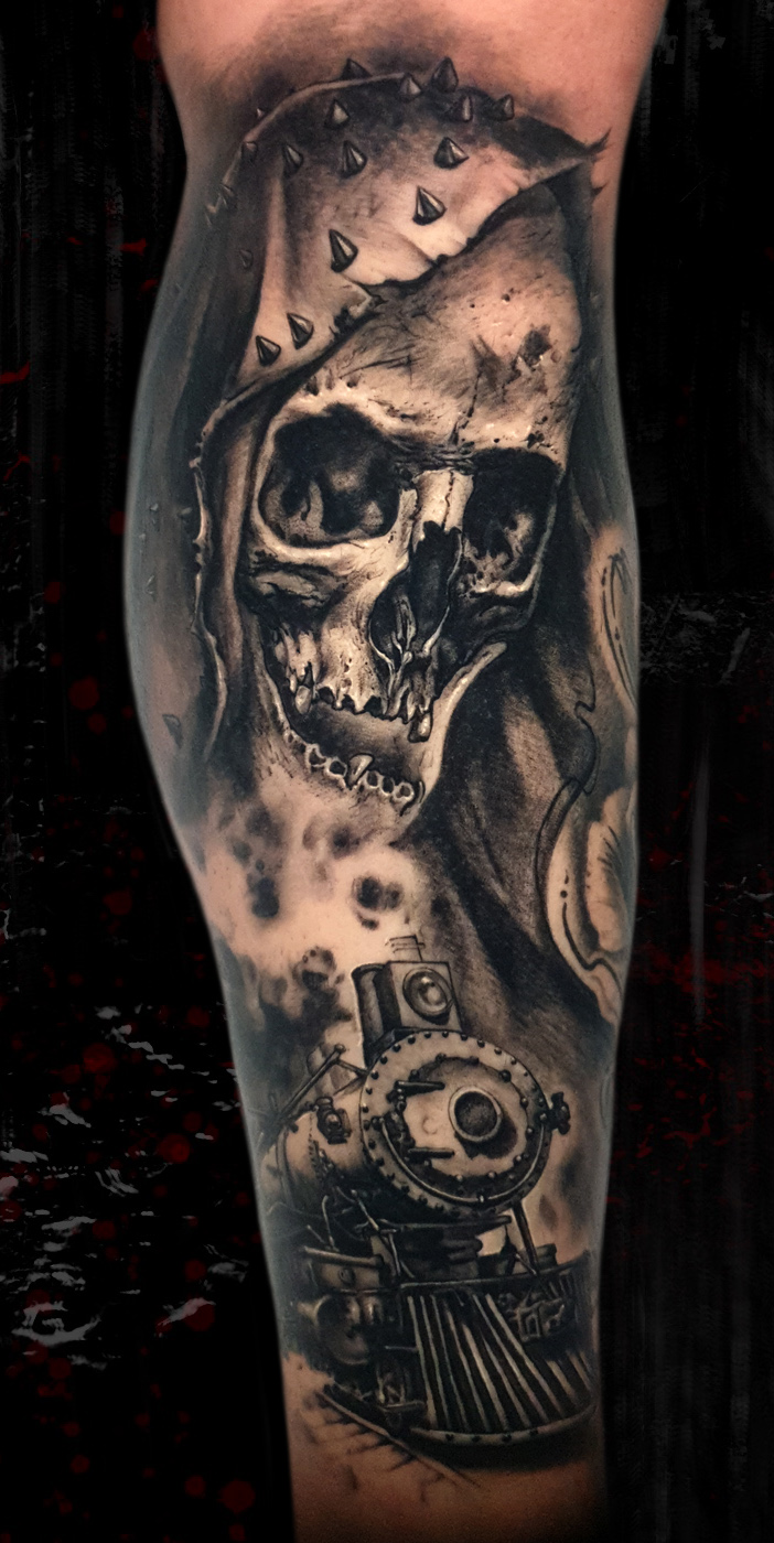 [vc_row][vc_column][vc_column_text]Skull and locomotive composition in the bottom part of the leg, black and grey. This tattoo is fully healed in the picture. [/vc_column_text][/vc_column][/vc_row]...