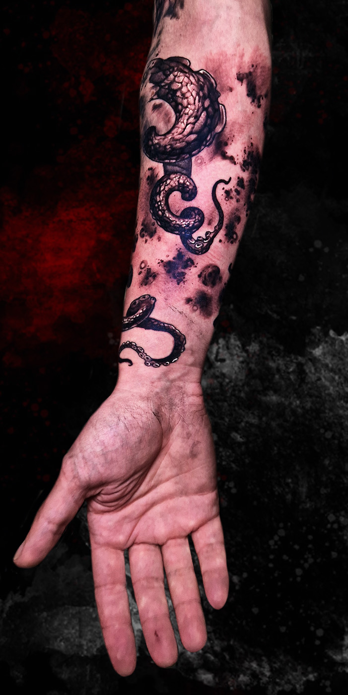 Full sleeve featuring an octopus that flows all around the arm. Water gives the piece empty spaces to let it breathe. Lines and background healed, textures...