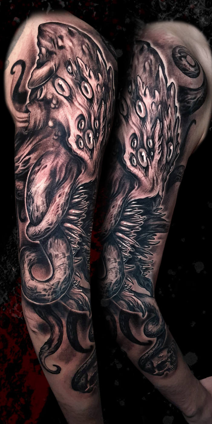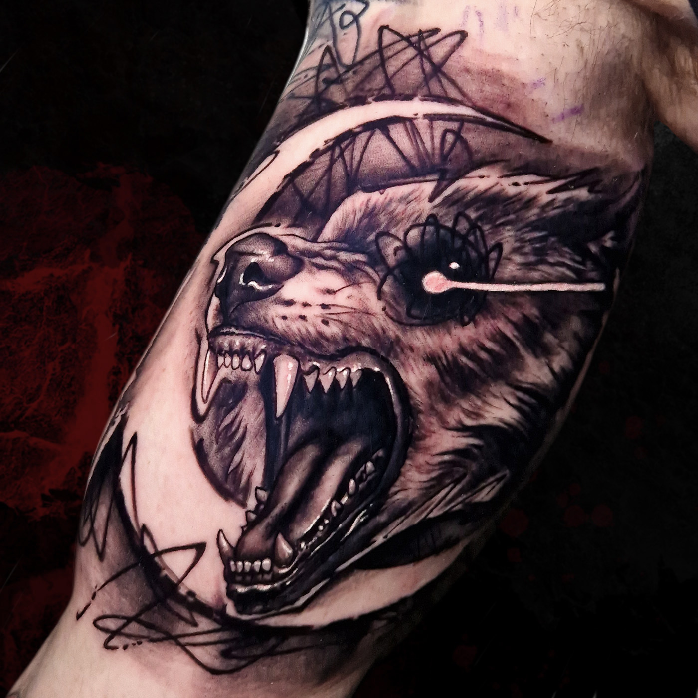 Graphic tattoo done with high contrast between ink and skin, black brushstrokes and negative space....