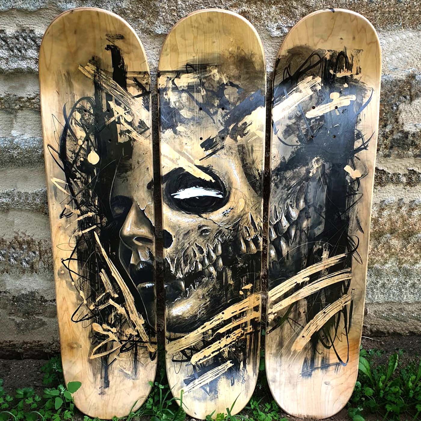 Skateboards hand painted with mixed media: ink, graphite and oil painting on wood. This skateboards were done to be shown at my friend Max Ghostar´s exhibition...