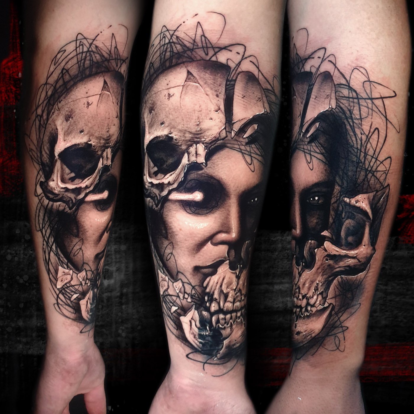 Girl face and broken skull, with some lines that give a graphic look to the piece. Done in a forearm, one session....