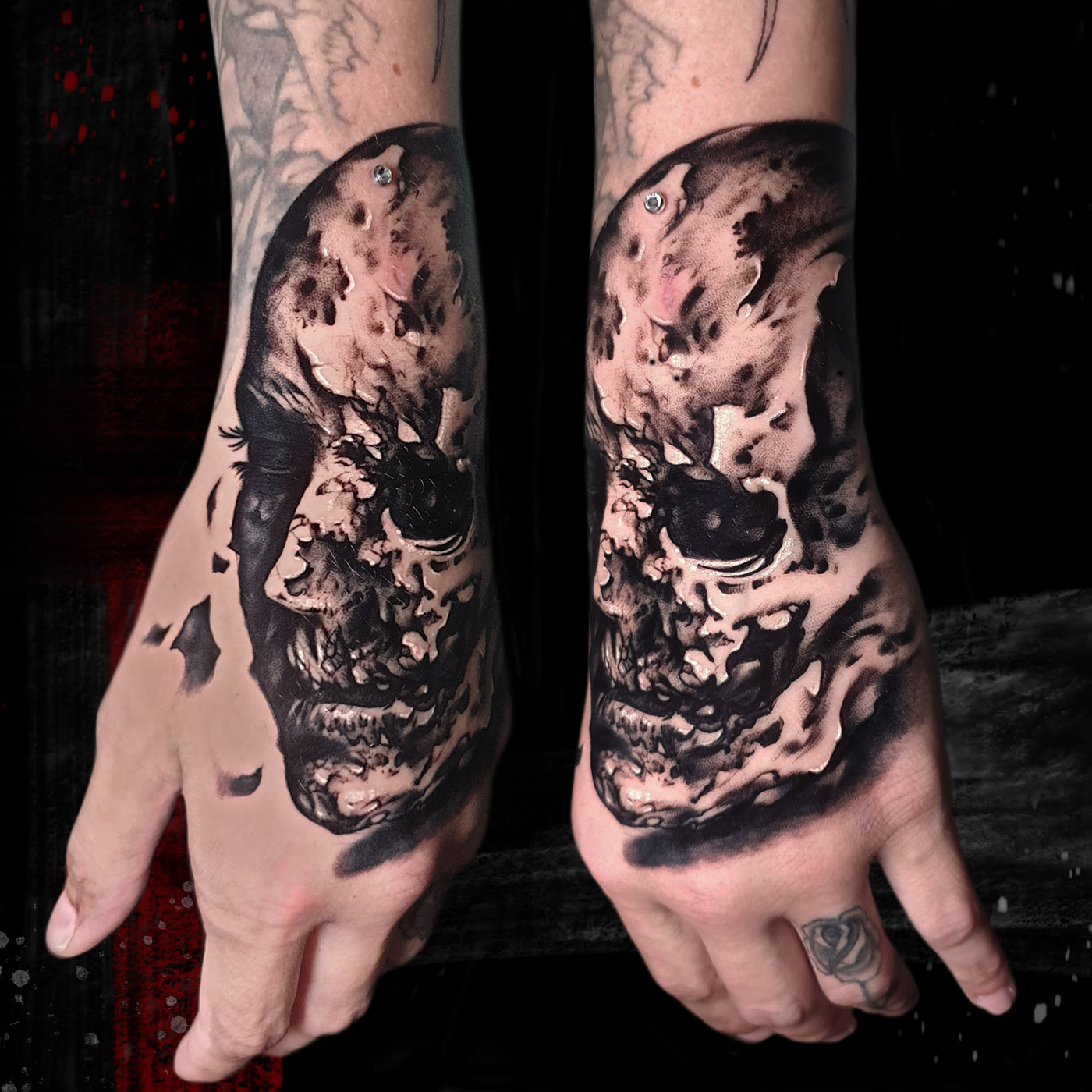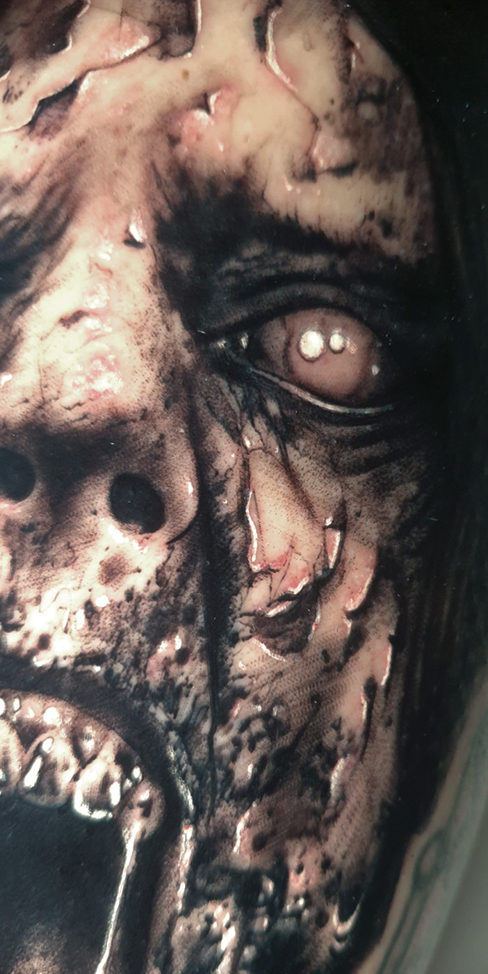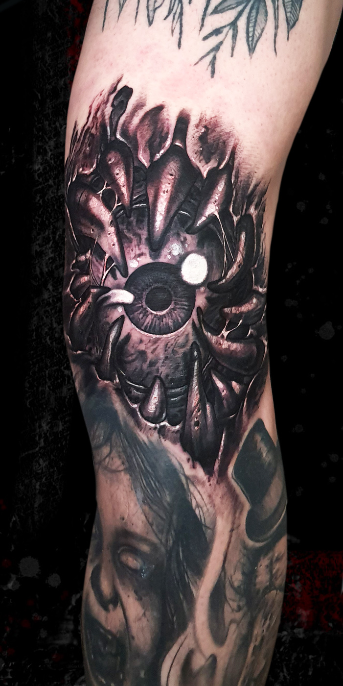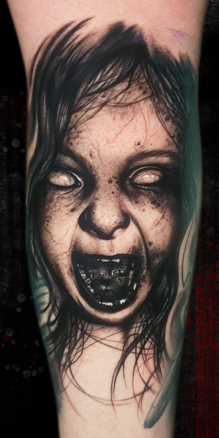 Little black and grey horror tattoo. In the pictures you can see the fresh and healed tattoo....