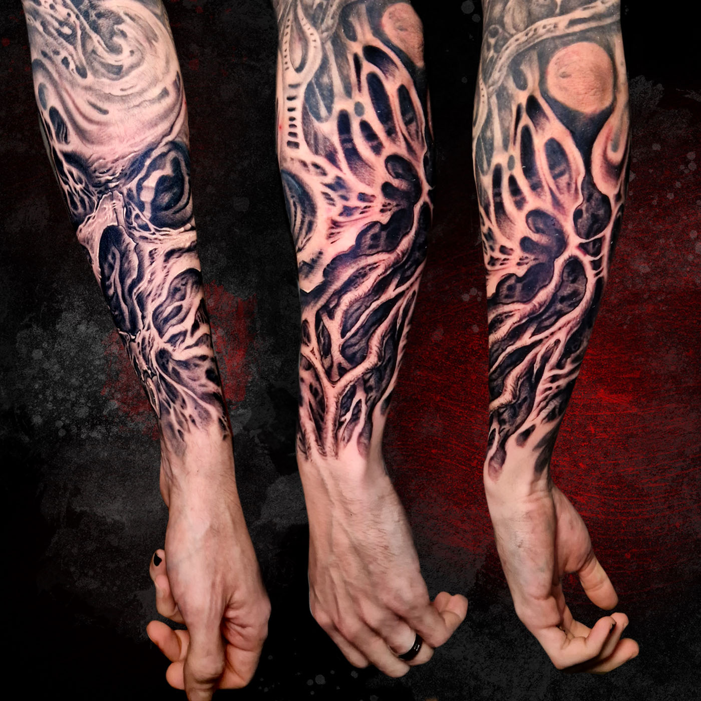 Abstract organic freehand tattoo. This part connects to the skull in the forearm, done only with textures....