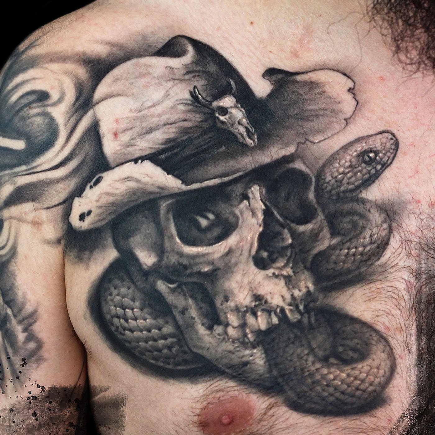 [vc_row][vc_column][vc_column_text]Skull with cowboy hat and snake, done at Drive_ink Tattoo, Swiss. In the picture, the tattoo is fully healed. [/vc_column_text][/vc_column][/vc_row]...