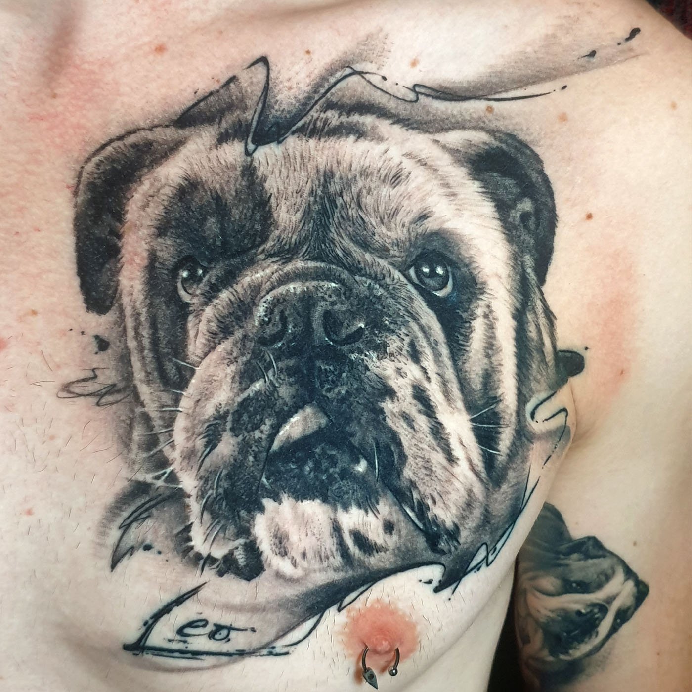 Black and grey portrait of Leo, the best friend of this costumer. Fully healed tattoo in the picture....