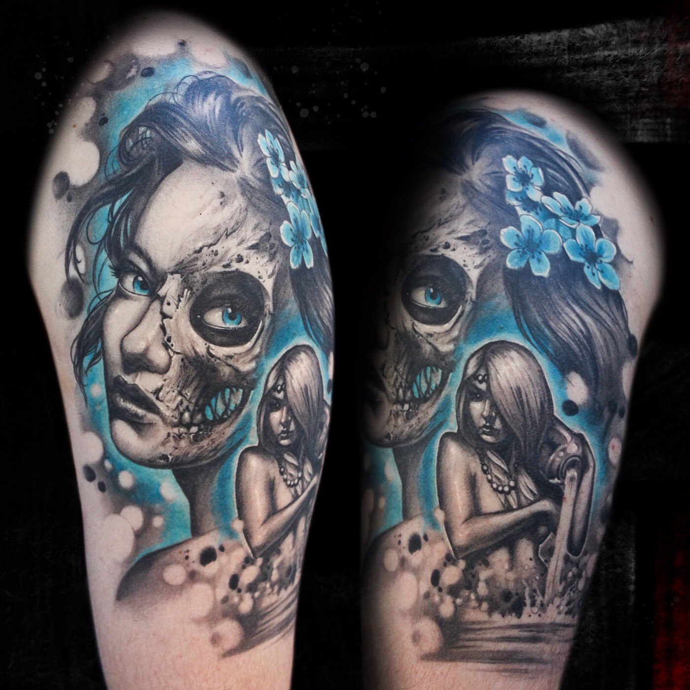 [vc_row][vc_column][vc_column_text]Girl face morphing into a skull, with another small feminine figure done in a shoulder. This costumer wanted to represent the zodiac sign Aquarium and...