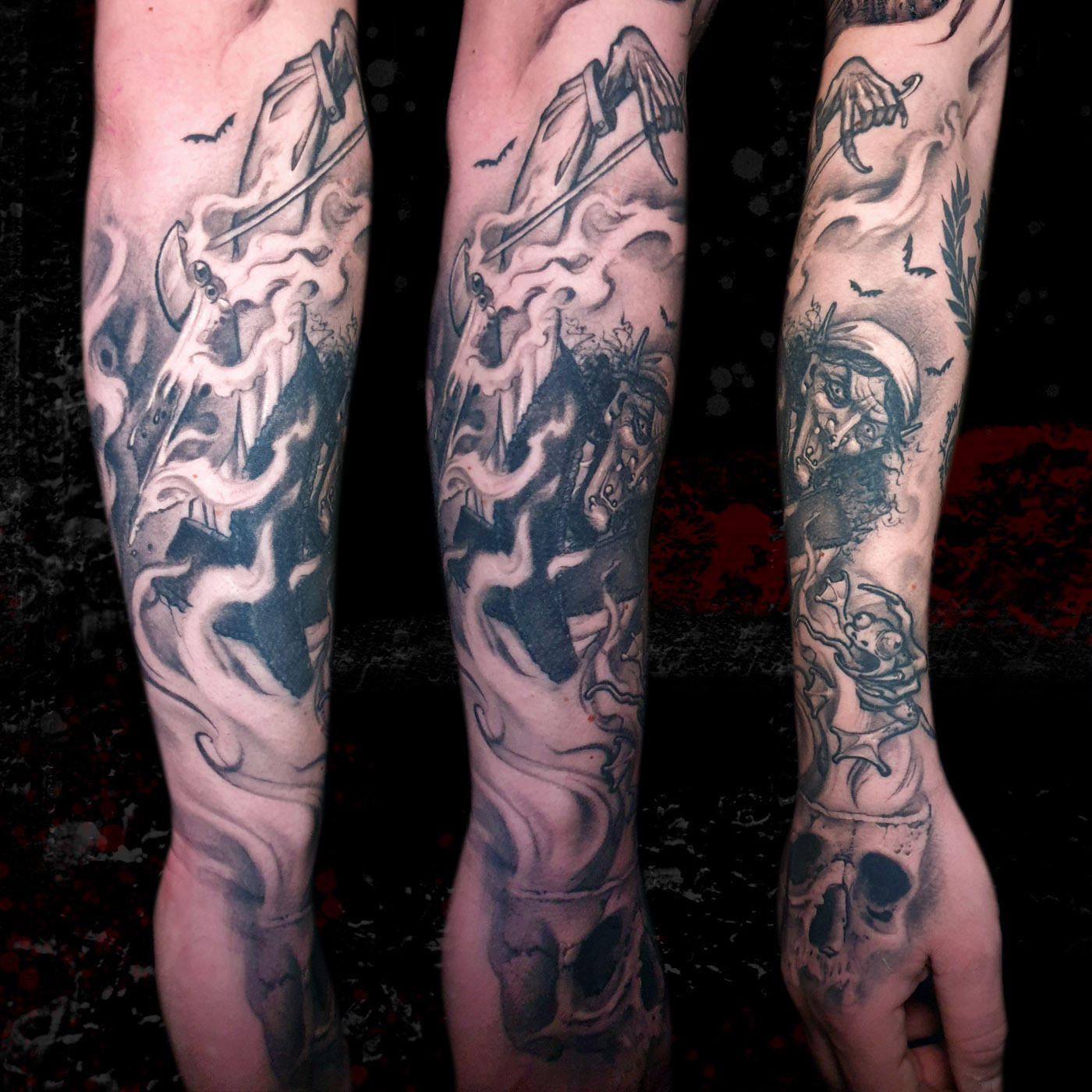 Calavera llevada a un estilo muy gráfico, con manchas de tinta, textura y zonas en negativo. Totalmente cicatrizado en la foto....
